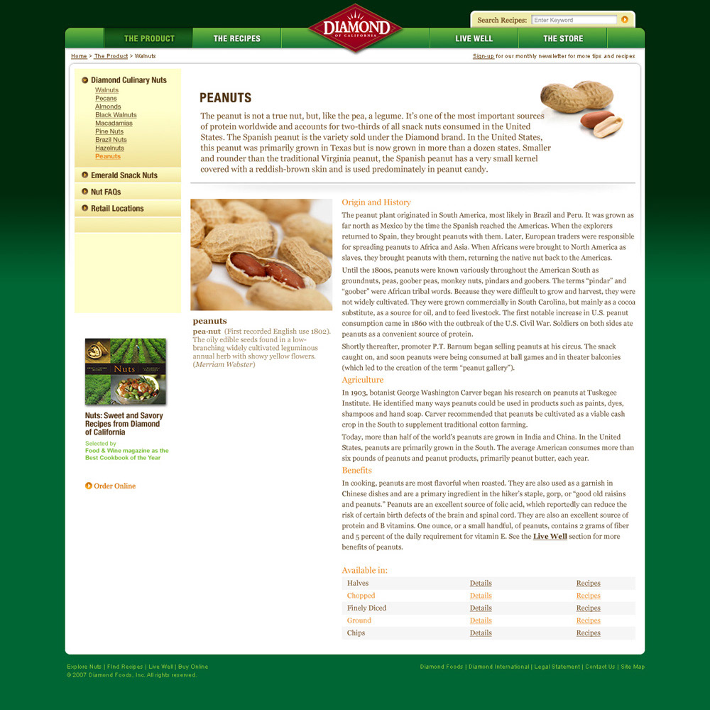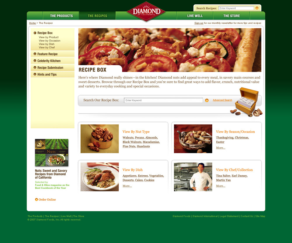 Diamond Nuts came to Real Branding seeking a complete refresh of their main corporate website. The refresh included new recipes for customers as well as history and healthy lifestyle information. Working in conjunction with another art director we were able to complete thr project ahead of schedule for a very happy customer.