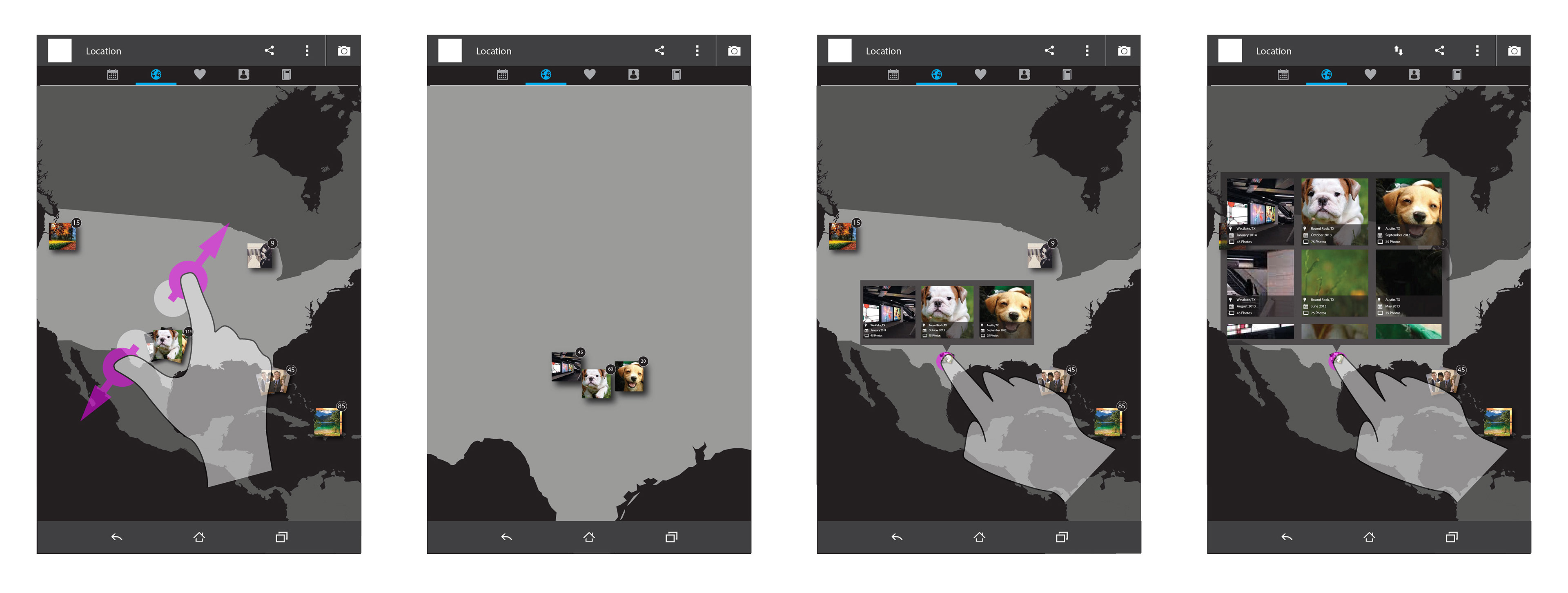 In particular, the photo gallery and camera application required advanced ideation to ensure the new technology available could be leveraged to the full extent. We began with the existing gallery and camera that came pre-loaded with the Android OS (4.4 KitKat at the time) and decided to improve it rather than start over. We identified several features immediately that were frustrating with the existing gallery such as the sometimes here and sometimes not camera quick access button. We also conceived several additions that we felt would add usefulness to the gallery over time such as a timeline and location view. To ensure we were not missing pieces, we created a series of flow documents for each feature. The partial examples below demonstrate a few of these including navigating through the new map view and taking measurements in photos.