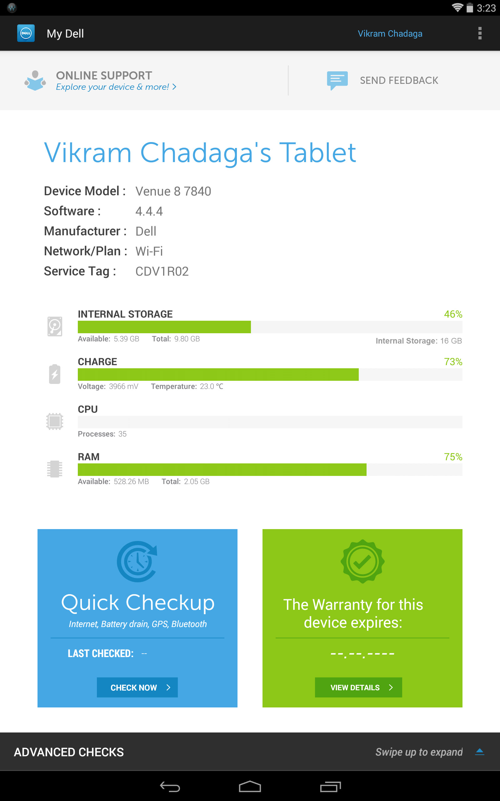 MyDell: We kept the application focused on providing transparency on device storage, gyroscope adjustments, and a way to easily contact Dell with any issues.